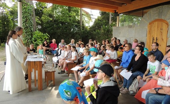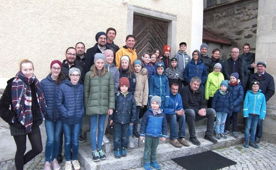 Der Obmann der katholischen Männerbewegung Franz Plöchl begrüßt 21 Kinder und 11 Väter am Treffpunkt vor dem Eingang zur Sakristei